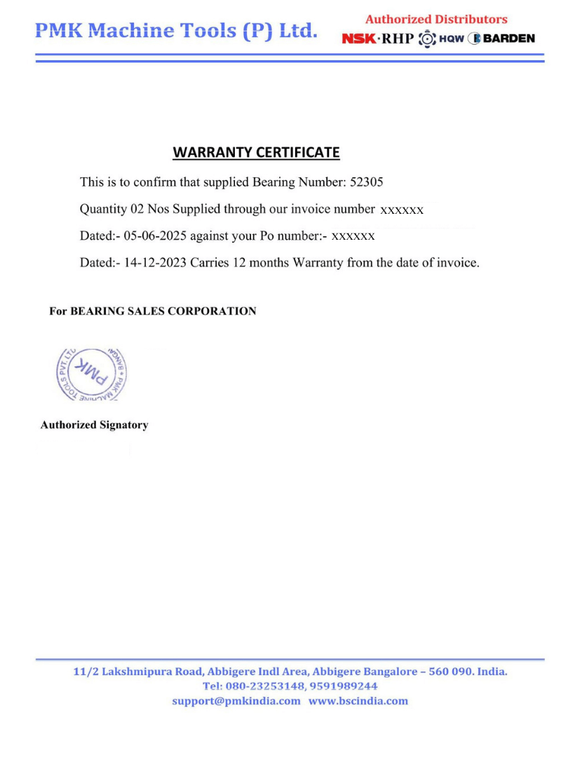 We are proud to be an Authorized Distributor for NSK. Every NSK bearing you purchase from us is 100% genuine and sourced directly from the manufacturer. Plus, all our products come with a 12-month free warranty against manufacturing defects, giving you complete peace of mind.